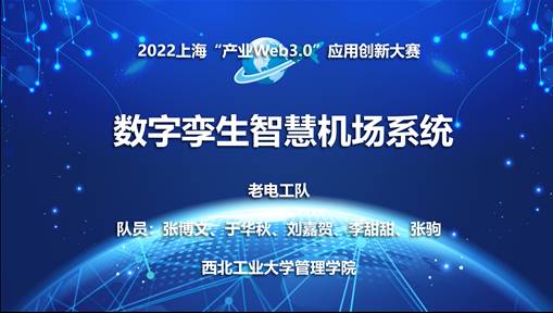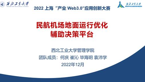 的四位研究生构成,团队基于Web 3.0数字孪生、区块链技术的框架,进行算法研究实现了飞行器停机坪分配、地勤车辆作业调度以及飞行器与车辆的路径优化;并开发了民航机场地面运行优化辅助决策平台,实时地可视化展示机场地面状况及决策结果。实现了物理空间和虚拟空间的实时交互,有效解决了机场高峰时期地面运行管理的相关问题。