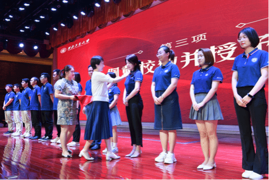 典礼上,党委书记乔彩燕为新生代表佩戴漫岛动漫