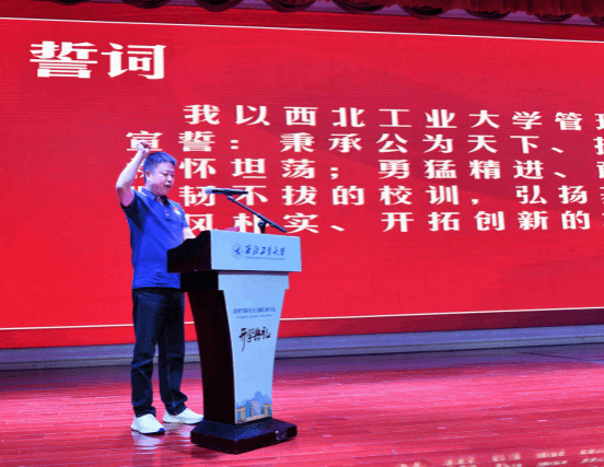 2023级全体新生在EMBA231班苏州尚豪智能科技有限公司总经理王刚的带领下进行庄严宣誓。