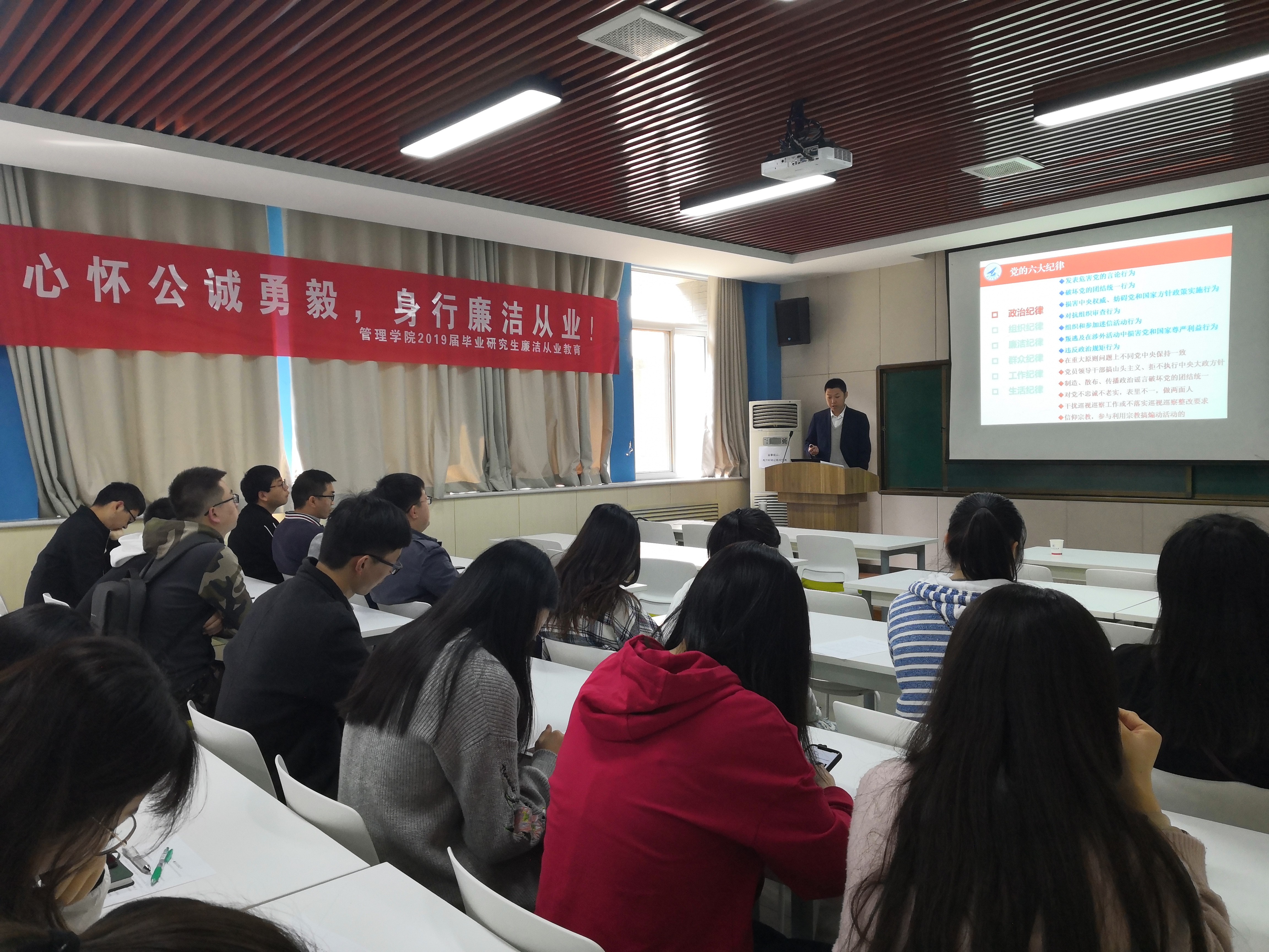 首先,曹子尧副书记对2019届硕士毕业生们圆满完成了学业、开启了人生的新征程表示祝贺。接着,纪委办副主任张鹏飞为全体毕业生进行了廉洁从业专题教育。他从以下几个方面向毕业生们强调了廉洁从业的重要性。一、切记党章中的三个准则,在生活与工作中遵守党章党规;二、纪律六大方面——政治、组织、廉洁、群众、工作、生活要时刻贯彻;三、介绍了监察法适用人员,涉及党员、公务员、国企人员等其他公职人员,强调切勿投机取巧,犯下大错。四、以“六个不得”再次警示同学们廉洁从业。最后,张鹏飞副主任对毕业生们顺利毕业表示祝贺,并祝愿毕业生们能够在职业道路上蓬勃发展,为祖国做出更大贡献。