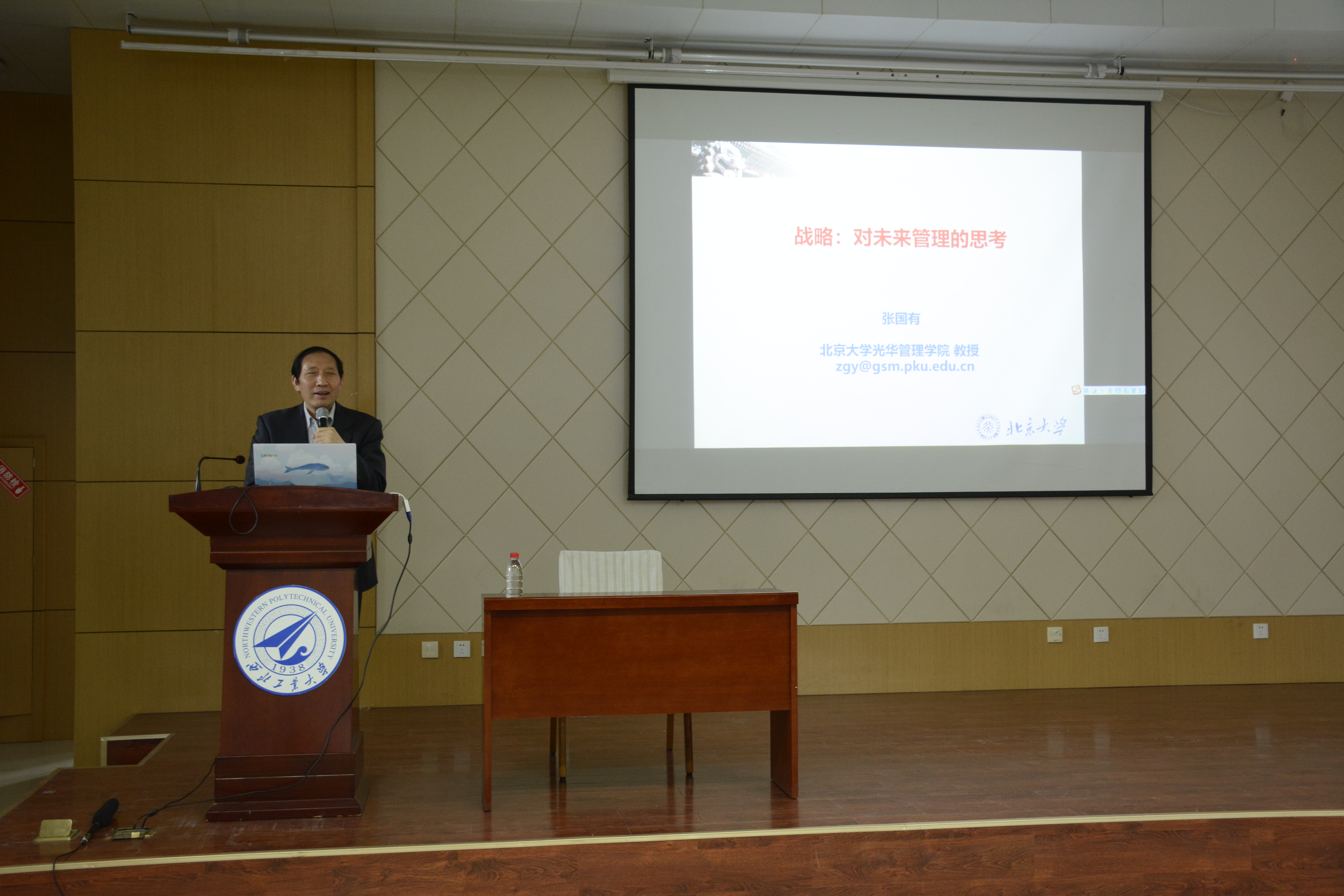 一开场,张国有教授便率先提出问题引入正题,他问道:“长远的、宏大的、俯拾皆是的战略到底是什么?”这一问题立刻引发了同学们的兴趣与思考热情,接着,张国有教授便开始正式讲授,他分别从现在流行的观点与战略由战术演变的历史两方面对战略给出了自己的见解,揭示了开篇之问的答案,这便是面向未来的眼光和思考,张教授强调我们要用未来的眼光看现在。