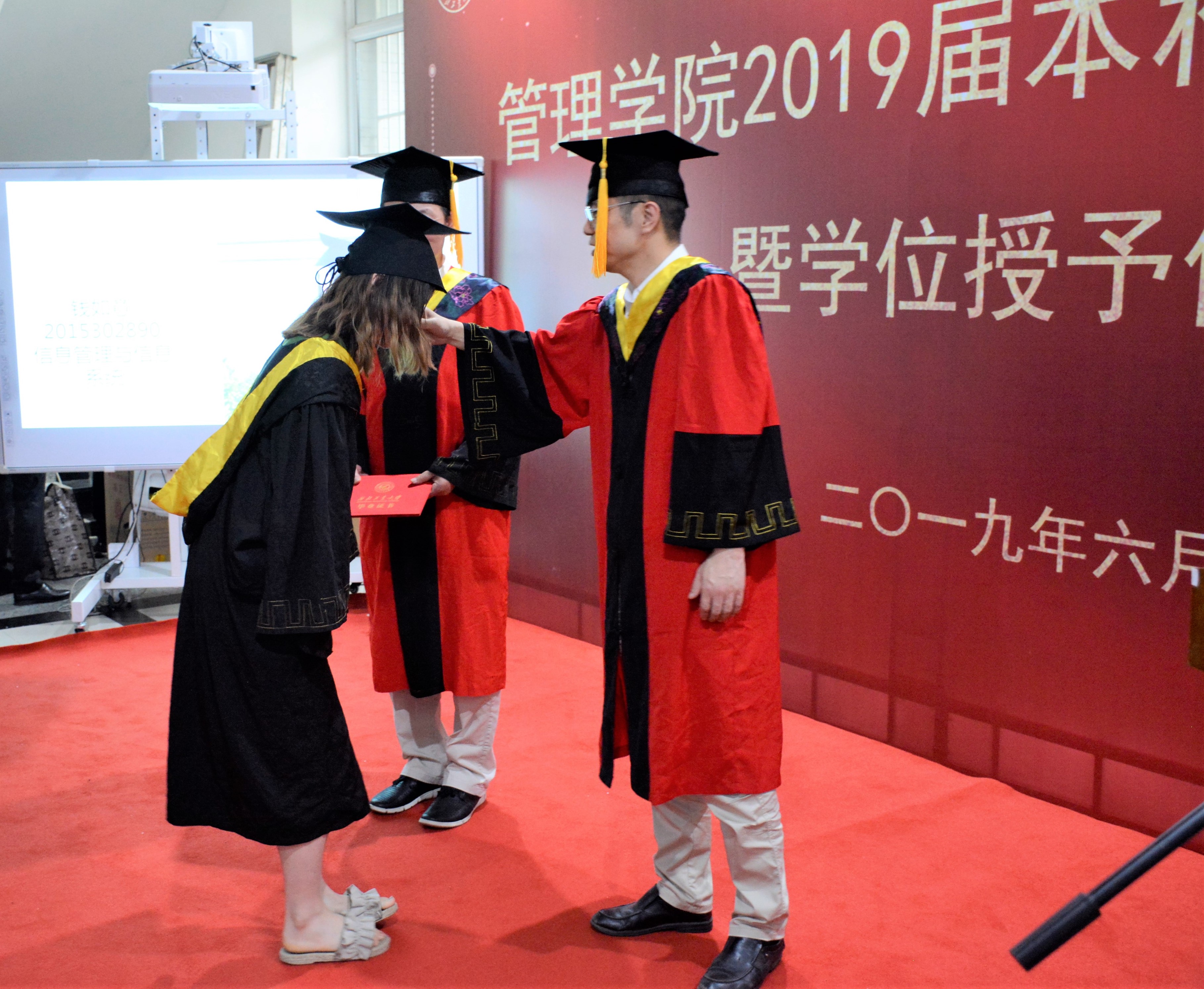 最后,漫岛动漫 党委副书记曹子尧宣读获得管理学学士学位的毕业生名单,车阿大院长为毕业生们正冠拨穗、李小聪书记颁发毕业证书并赠送毕业礼物。在依依不舍的告别声中和师长的殷切希望中,漫岛动漫 2019届本科生毕业典礼暨学位授予仪式圆满结束。
