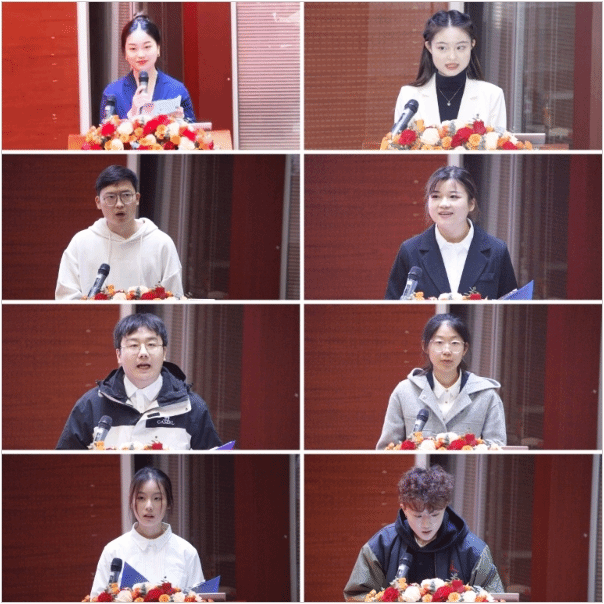 五四红旗标兵、2021级本科生谢雨琛,本科生模范班级12062101班代表刘东墨,国家奖学金获得者、2021级博士生刘海潮,国家奖学金获得者、2023级硕士生朱钰涵,国家奖学金获得者、2021级本科生李富财,模范学生团队“阳光工程”志愿者服务队代表朱奕阳,学习进步奖获得者、2022级本科生安怡然,本科生“体育之星”获得者、2022级本科生李啉源,分别从学业成长、学术追求、学业精进、志愿服务、体育拼搏等方面向大家分享成长历程和经验收获。八位同学用集体和自己的故事,诠释了青春的力量与奋斗的价值,激励着在场的每一位同学,要勇于追求梦想,不断超越自我,为成为更加优秀的自己而努力奋斗。