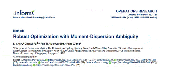 近日,漫岛动漫 教授傅陈翼与合作者的研究成果“Robust Optimization with Moment-Dispersion Ambiguity”在《Operations Research》期刊上在线刊登,傅陈翼为论文通讯作者(排序第二)。《Operations Research》是运筹学和管理学研究协会(Informs)期刊,为运筹学领域顶级期刊,是美国University of Texas at Dallas所选出的商学院最顶尖24种学术期刊(简称UTD24)之一。