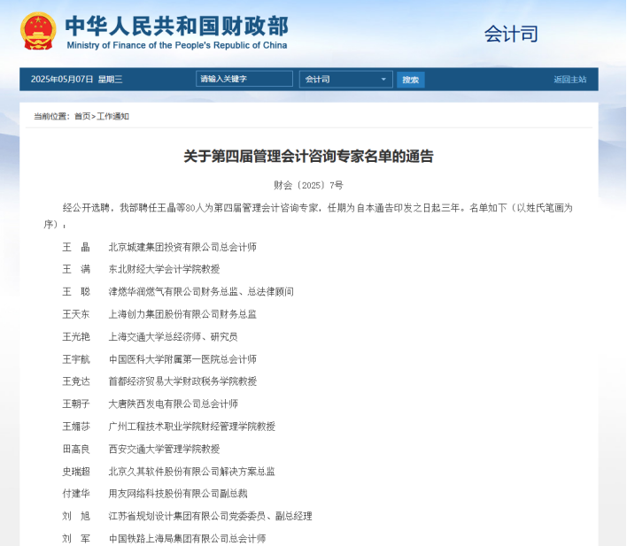 为促进企业和行政事业单位高质量发展,深入推进中国特色管理会计体系建设和应用,财政部面向全国公开选聘第四届管理会计咨询专家,经过严格审查、择优选聘,最终聘任长期从事管理会计相关工作、具有丰富成果经验、做出突出贡献的80人担任咨询专家,任期3年。