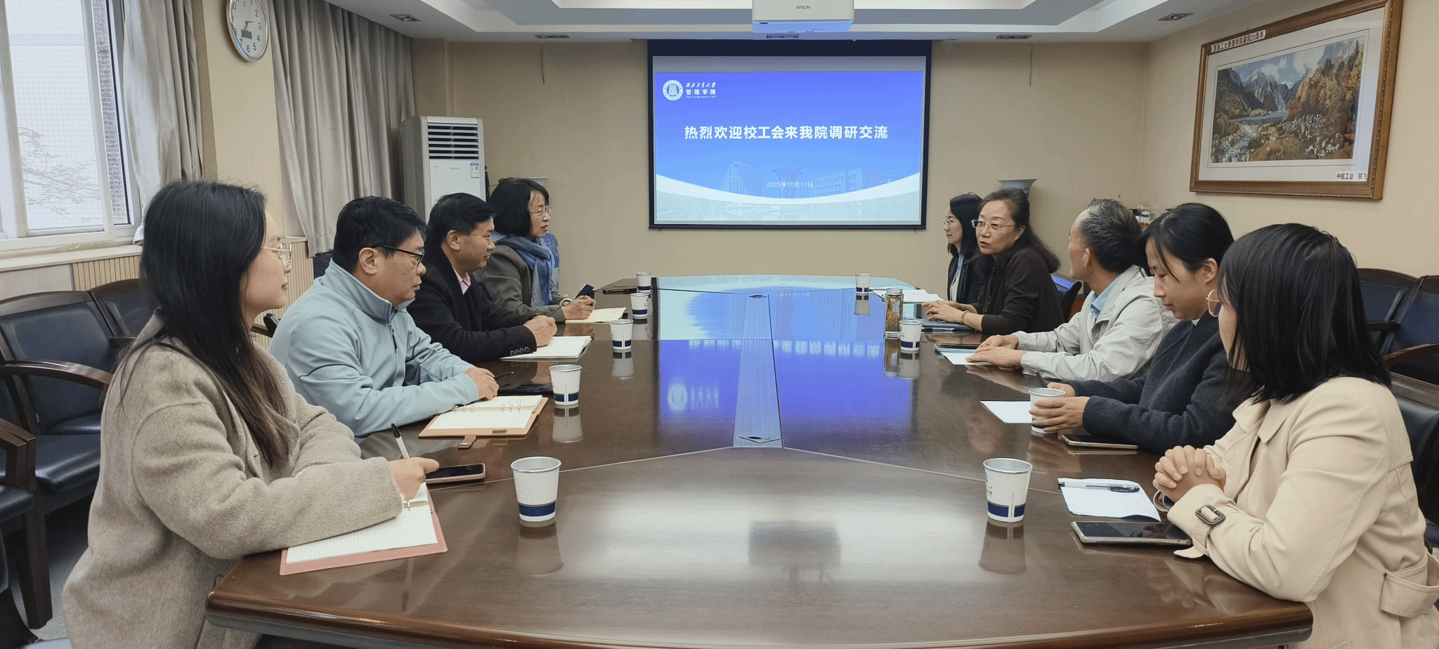 调研期间,校工会主席陈建军介绍了此次调研的目的,旨在进一步加强校工会与院工会之间的沟通联系,共同探讨新时期工会工作的模式与路径,切实推动院级工会组织建设与发展。会上,张爽代表学院对建军常务副主席一行表示热烈欢迎,对校工会一直以来给与学院的指导、支持与帮助,表示衷心感谢。蔡建峰就学院教代会常态化与工会工作规范化建设情况作了汇报。随后,与会人员围绕工会职能发挥、教代会制度建设、教职工思想动态等展开了深入的研讨。
