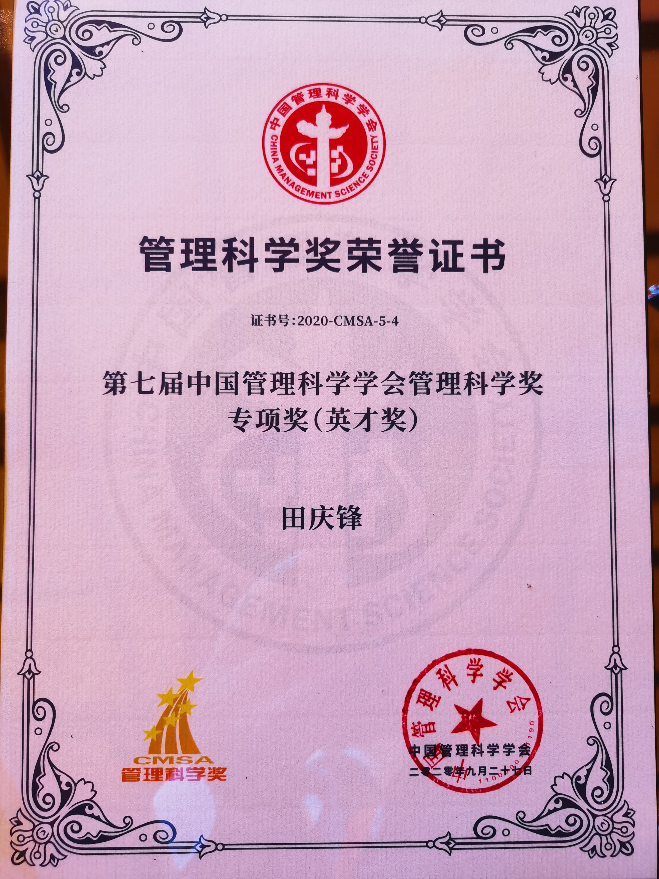 田庆锋教授获得管理科学奖专项奖-英才奖,该奖项是首次针对从事管理研究和实践的个人颁发的奖项,全国共10名,其中来自高校的获奖者3人。本届获奖的其它高校还有大连理工大学、北京理工大学、南京理工大学、北京大学、清华大学等。本届也是漫岛动漫