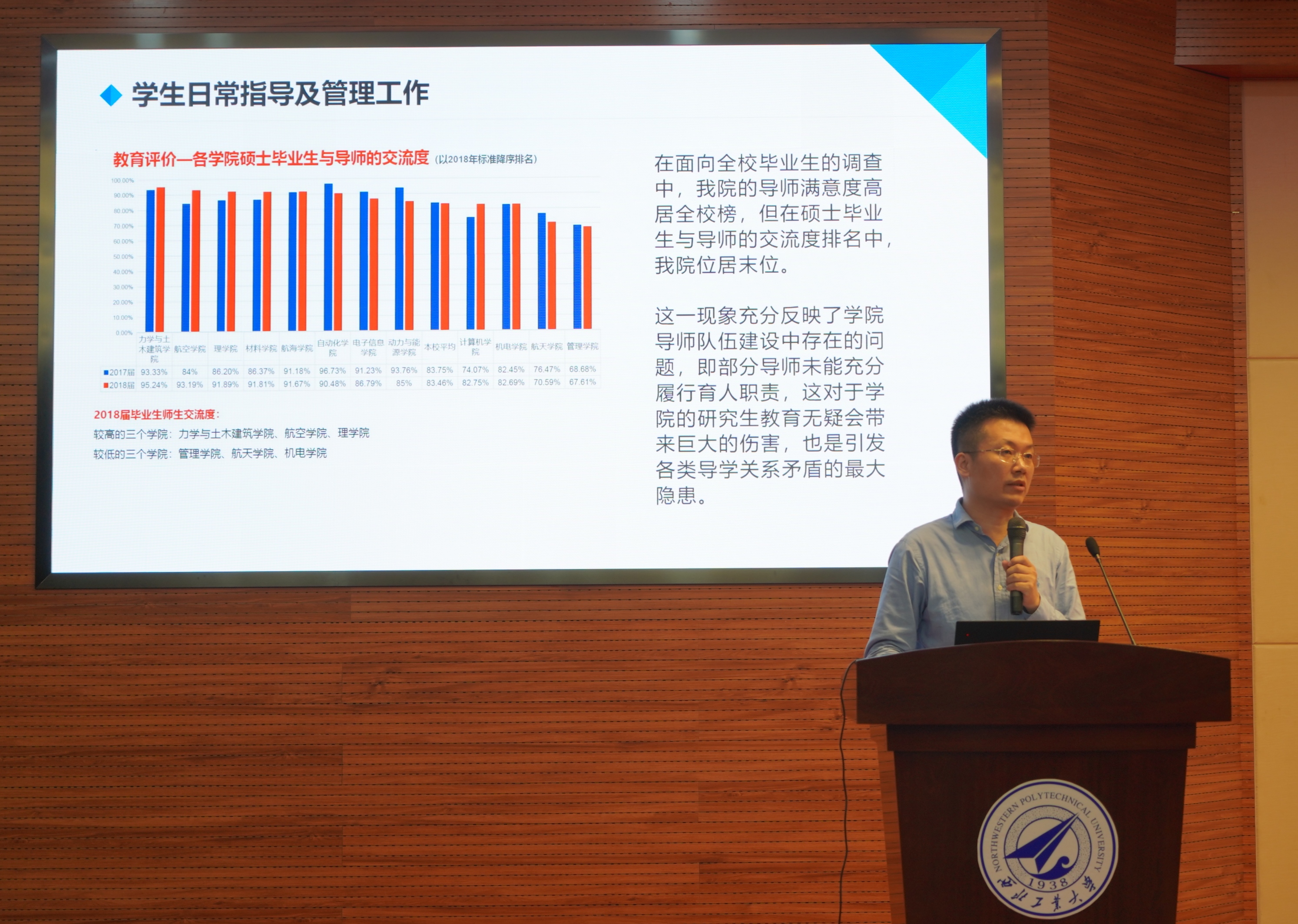 副院长贾明首先对研究生管理工作的开展情况进行了通报,接着,就学院近年来项目申报和立项情况进行了具体分析,通过与兄弟院校申报情况比对,指出当前学院项目申报中的主要问题,并就如何克服困难、规避短板提出了具体举措。副院长郭云涛对学院专业学位的招生报名、培养管理以及社会实践等方面工作进行了详细介绍。希望老师在学生培养过程中结合专业学位学生特点加强管理。院长助理白洁对学校奖学金评定工作的四项新变化做了说明,并就2020届学生就业情况进行了通报。