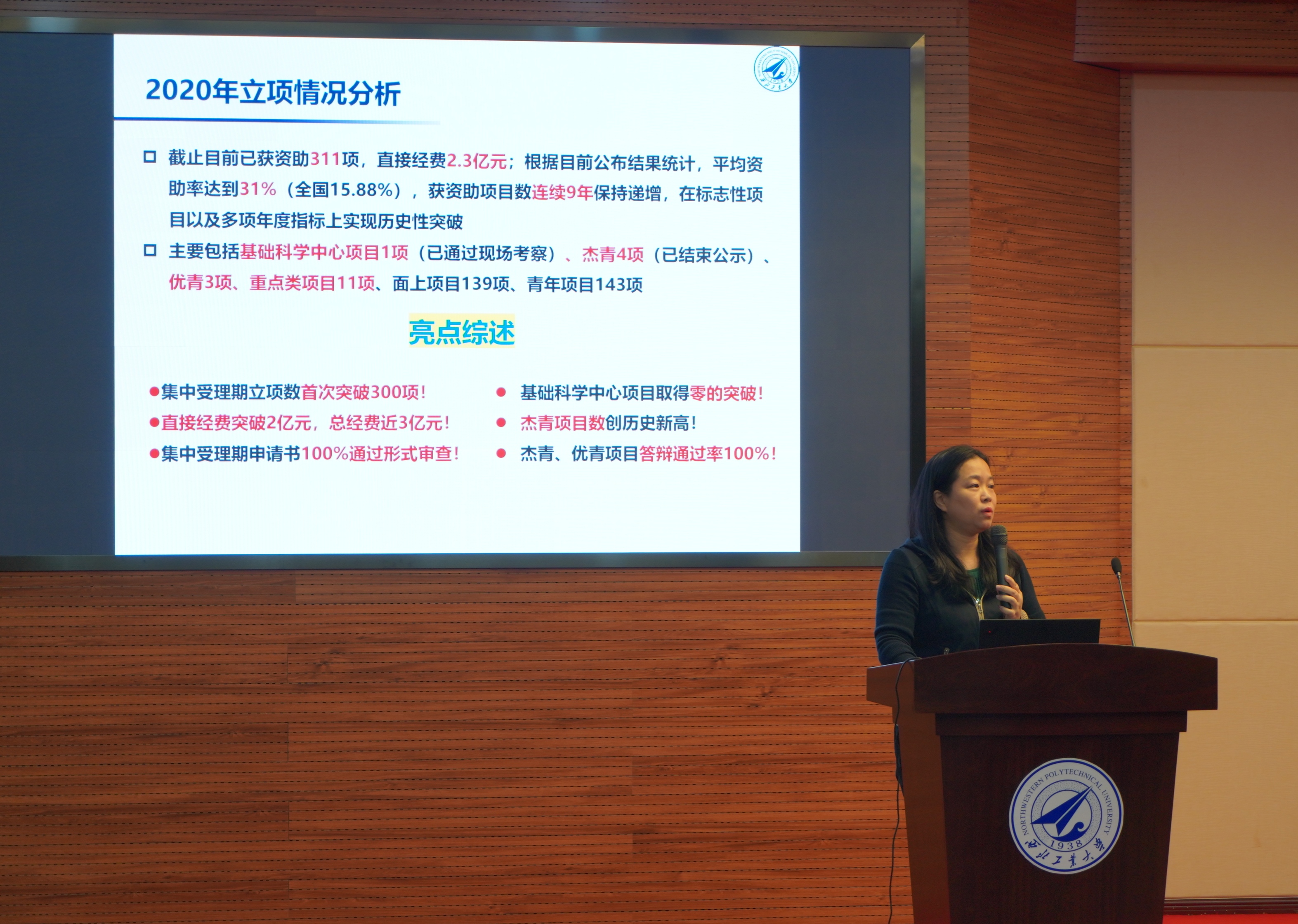 科学技术研究院副院长李蕴从项目的类型、选题到前期的成果准备进行了深入的解读,接着,结合近年来学校的实际情况以及自身多年的研究体会,就项目申报中的申报流程、申报书的撰写以及注意事项等内容进行了详细的讲解。最后,她鼓励老师早做准备,夯实研究基础,潜心撰写申报书。
