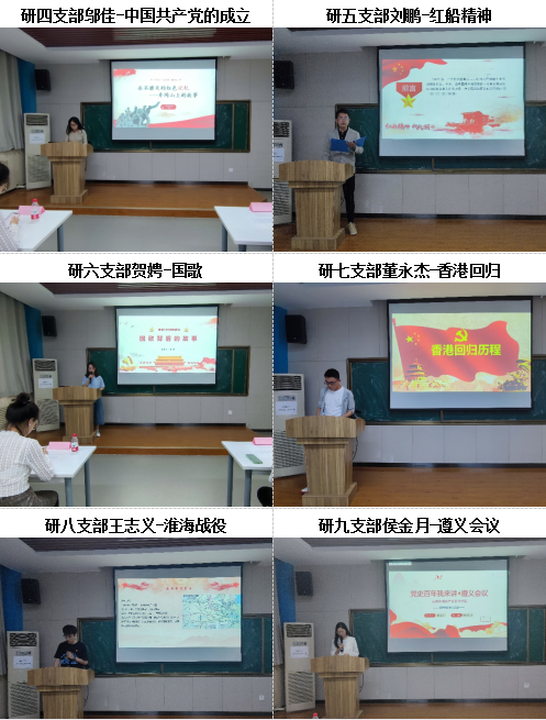 在比赛过程中,13位演讲者依次上台展示,紧紧围绕中国共产党历史,声情并茂地讲述建党故事、红色革命精神、英雄人物事迹等,再现了中国共产党发展的历史画卷。12031901班团支部成员深刻为大家讲解了五四运动的全过程;本二支部陈麒同志为大家分享了入党誓词的产生;研一支部王林琳同志从个人角度系统介绍了党史脉络;研二支部安琪同志为大家深情歌颂了延安精神;研三支部吴艳芳同志以信仰的光芒为主题进行了共产党宣言的讲解;研四支部邬佳、周子璇分别分享了共产党人永不磨灭的红色记忆——井冈山上的故事,秋收起义——中国革命新道路的伟大开端;研五支部刘鹏同志为大家生动地诠释了红船精神;研六支部贺娉同志饱满深情地讲述了国歌背后的故事;研七支部董永杰同志怀着无比激动自豪的心情讲述了香港回归的故事;研八支部王志义同志以激昂的心情歌颂了淮海战役的伟大胜利;研九支部侯金月同志为大家分享了伟大的历史转折点——遵义会议;研十支部唐美奂同志以为中华之崛起而读书为主题讲述了周恩来同志的故事。