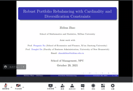 2021年10月29日下午13:00,西安电子科技大学数学与统计学院赵志华老师通过线下和线上相结合的形式做了题为“Robust Portfolio Rebalancing with Cardinality and Diversification Constraints”的讲座。本次讲座由赵龙峰副教授主持,漫岛动漫