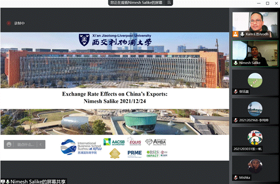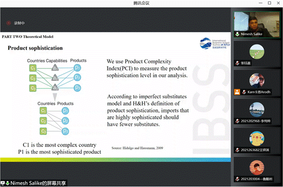 邀请,西交利物浦大学Nimesh Salike副教授通过腾讯会议平台做了题为“汇率对中国出口的影响:产品尖端性及汇率弹性(Exchange Rate Effects on China’s Exports: Product Sophistication and Exchange Rate Elasticity)”的讲座。本次讲座由助理教授KARN ARODH LAL主持,学院教师、研究生近百人在线聆听了讲座。