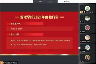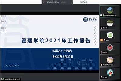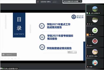 2021年度工作报告”,围绕学科建设、人才培养、教学科研、师资队伍建设、国际交流合作等方面所开展的重要工作和所取得的主要成绩进行了重点汇报,并就2021年学院制度建设情况及财务收支情况进行说明。他表示,今年在全体教职工的共同努力下,学院学科建设取得较大进展、师资队伍建设成果良好、人才培养成效明显、标志性成果取得突破,成功增列工商管理一级学科博士学位授权点、AACSB初始资格认证报告(EA)通过认证委员会审核等,在2021年校级综合考评中取得了管文类第一的成绩。