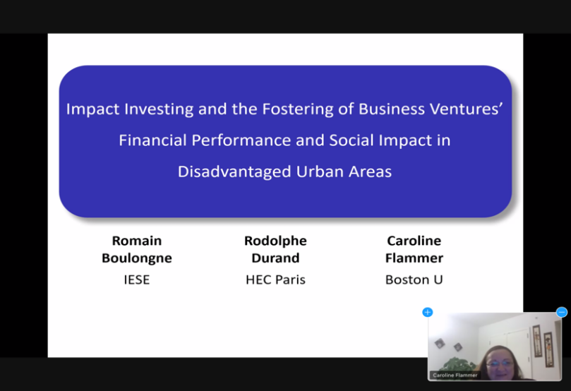 研究分享结束后,Caroline Flammer教授与参会师生进行了在线交流,耐心解答了与会师生提出的问题。张莹副教授对学术报告会进行了总结,并对Caroline Flammer教授带来的精彩报告表示感谢。