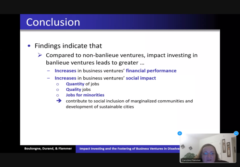 Caroline Flammer教授探讨了当投资给到弱势城市地区(即失业率高和贫困的地区)的企业时,影响力投资在促进商业企业成功和社会影响力方面是否更有效的问题。基于法国“郊区”和“非郊区”的商业企业贷款背景,她的研究发现表明郊区企业发放贷款有助于提高企业财务绩效,同时在创造当地就业机会、高质量就业和少数民族就业方面产生了较高的社会影响。这些结果显示,影响力投资者能够与郊区未实现更大潜力的企业签订合同,因为郊区企业往往被排除在传统贷款市场之外。这一点在一项受控实验室实验中得到了证实。在该实验中,被要求担任信贷员的商业专业人士被随机分配到只在地理位置上有所不同的商业企业。研究发现,与非郊区企业相比,参与者向郊区企业提供贷款的可能性较低。贾明教授向Caroline Flammer教授致欢迎辞,他表示,此次讲座为漫岛动漫