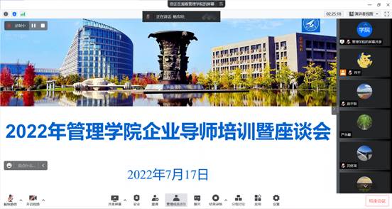 企业导师的基本情况和本次培训暨座谈会的背景进行了简要介绍。随后,MBA/MEM教育中心主任杨宏玲、MPAcc教育中心/案例研究与开发中心主任金帆、MBA/MEM教育中心副主任孙若妮先后结合企业导师近一年来工作开展的相关情况,重点对企业导师工作开展过程中的要求和注意事项进行了深入细致地说明。