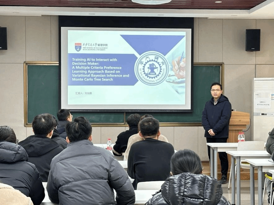 信息系统与智能商务系刘佳鹏教授做客长安校区学院楼214报告厅与学院师生展开学术交流,作题为“训练人工智能与决策者交互:基于变分贝叶斯推理和蒙特卡罗树搜索的多准则偏好学习方法”的学术报告。本次报告由李乘龙副教授主持,学院教师和研究生参加了此次报告会。会议开始前,李乘龙老师对刘佳鹏的个人情况、学术成果等进行了简要介绍,对他的到来表示了热烈欢迎。