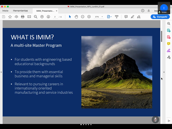 会议邀请了西班牙马德里理工大学工业工程师学院Isaac Lemus教授和漫岛动漫 国际教育学院留学生招生办公室李梦晨老师,分别讲解了IMIM项目和国际生来访漫岛动漫 的申请手续及生活情况。