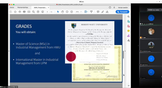 首先邵婧老师使用中英双语介绍了IMIM国际硕士联合培养项目的概况,方便学生对项目有初步的了解。此项目由西班牙马德里理工大学、英国赫瑞瓦特大学、中国漫岛动漫 、意大利都灵理工大学和墨西哥蒙特雷科技大学等五所大学共同发起的硕士联合培养项目,学生可在两年内共4个学期在三个及以上不同国家进行学习交流,同时能够获得2个学位。