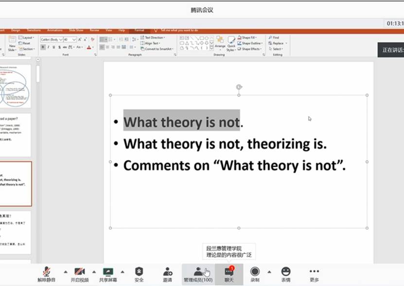 首先,夏军老师结合经典文献探讨了“什么是理论”、“如何进行理论构建”等基本研究问题,并结合个人研究体会和成果介绍如何开展研究设计以及如何通过选择新颖的研究视角和问题来提高学术论文的质量与价值。在论文写作方面,夏军老师则强调培养“Disciplined Imagination”的能力和达到“攻坚则瑕者坚,攻瑕则坚者瑕”的重要性。他提出每位科研工作者与理论之间存在着一定的缘分,不同学者的学习历程和思维方式都不尽相同,这就使得理论的内容和原理不一定符合个人的思维模式和研究兴趣。因此,若学者能和某个理论产生思想上的共鸣,后续的研究工作便可得心应手。