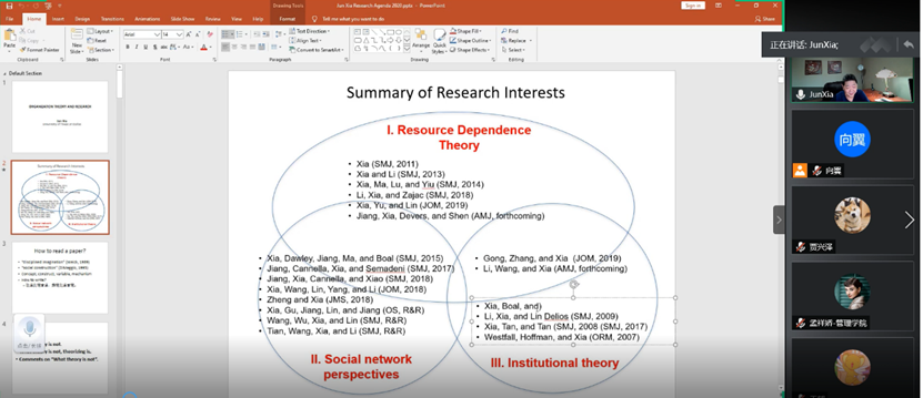 随后,夏军老师在研读经典文献的基础上,结合其研究成果详细讲解了“资源依赖理论(Resource Dependence Theory)”、“制度理论(Institutional Theory)”、“种群生态学理论(Population Ecology)”、“交易成本理论(Transaction Cost Theory)”和“利益相关者理论(Stakeholder Theory)”的原理、运用和研究热点。例如,针对资源依赖理论,夏老师诠释了如何理解资源依赖理论中权力(Power)与依赖(Dependence)之间的恒等关系,介绍了权力不平衡(Power Imbalance)情景下企业实施应对策略的路径与方式等要点;针对制度理论,通过讲解经典文献对制度理论中的核心概念即“合法性(Legitimacy)”的内涵进行了深入分析,并进一步对制度理论的发展进行了诠释;针对种群生态学理论,夏老师基于该理论的起源文章进行了详细分析,强调逻辑推导和思维方式的重要性。同时,夏老师在论文解读过程中也强调我们应该学习经典文献的思维模式,而不仅仅是了解作者研究了什么。