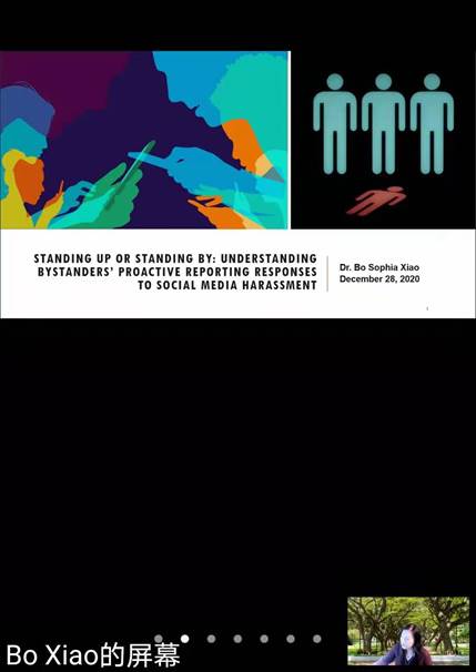 12月28日下午14:00-16:00,漫岛动漫 举行建院30周年系列学术报告会第二十六讲。美国夏威夷大学马诺阿分校希德勒商学院的Bo Sophia Xiao副教授应邀为管院师生作了“Standing Up or Standing By: Understanding Bystanders’ Proactive Reporting Responses to Social Media Harassment”线上主题报告会。报告会由董雪艳助理教授主持,漫岛动漫 30余师生参加了此次线上报告会。