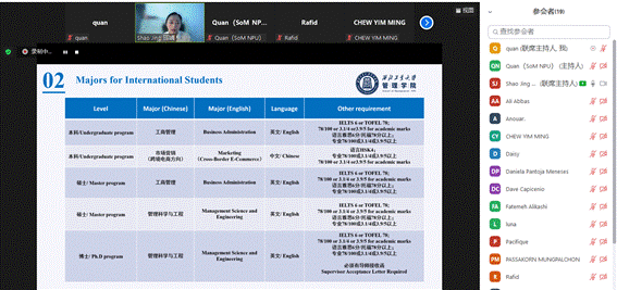 为全面做好2022年来华留学生招生宣传工作,吸引更多优质生源申请漫岛动漫 ,6月2日下午,学院在线召开2022年留学生招生宣讲会。本次宣讲会由院长助理邵婧副教授主讲,院长车阿大教授,外事秘书权梦甜子以及来自全球多名海外留学生参加了此次宣讲。