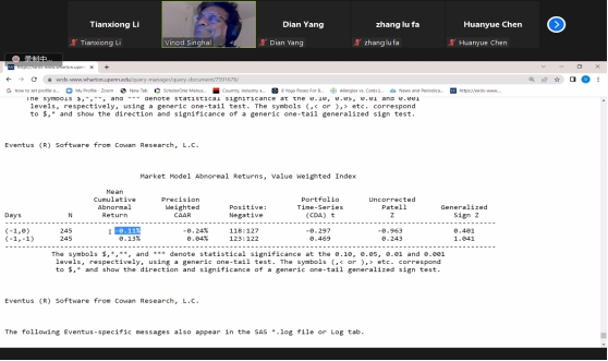 事件研究法是指运用金融市场的数据资料来测定某一特定经济事件是否对上市公司价值产生影响的一种统计方法,它是通过使用与股东价值和运营绩效相关的指标来分析特定事件对公司绩效的影响。在《事件研究法》课程中,Vinod教授主要从实证研究的角度分别介绍了事件(event)的概念和定义、非正常报酬率的计算以及准确查找和收集数据的方法等事件研究法的基本概念和方法,使同学们充分了解到事件研究法的相关知识和研究步骤。然后,通过引入一个详细的案例,全面而细致地分析了如何界定事件及事件期间,以及如何运用事件研究法来估计公告或其它事件对公司运营绩效的影响。