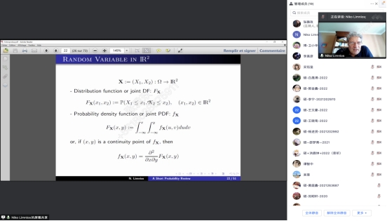 吴蓓副教授邀请,法国贡比涅技术大学应用数学实验室的Nikolaos LIMNIOS教授为我校硕博研究生线上讲授了《应用随机过程》(AppliedStochastic Processes)课程,该课程总时长为32学时,吸引了我校多名师生前来聆听。