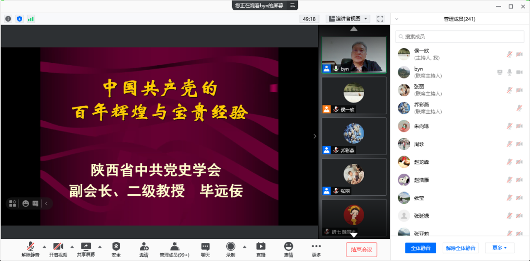 “学好百年党史,感悟初心使命”,毕远佞教授旁征博引,重点突出,梳理了党百年奋斗史的重点人物、重点事件、重点阶段,帮助大家加深了对中国共产党历史发展的宝贵经验和思想理论的认识,更加体会到党领导中国人民争取民族独立、人民解放和实现国家繁荣富强、人民共同富裕的初心和使命,更加清楚的认识到中国共产党为什么能、马克思主义为什么行、中国特色社会主义为什么好。并告诫大家要践行初心使命、增进勇气信心,在危机中育新机、于变局中开新局,围绕中国共产党成立100周年,挖掘身边的红色基因,用好周边红色资源。