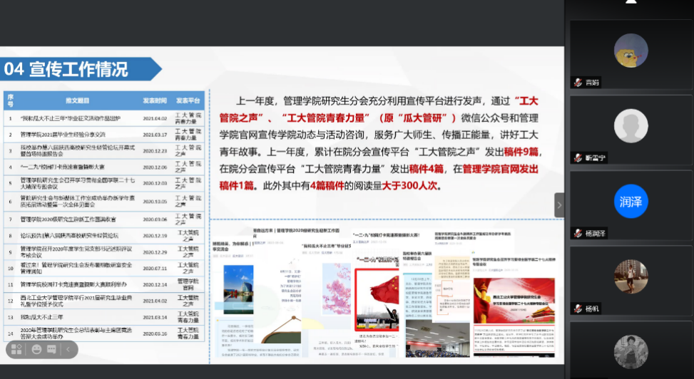 研究生会的组织建设情况,通过举办多次团建、素质拓展等活动,加强了研会成员间的友好沟通和情感交流,并取得了良好效果。然后,她总结介绍了去年研会的活动开展和宣传工作情况。上一年度的活动颇丰,并且获得了老师和同学们的一致好评,举办了多项特色活动,如全省高校研究生经济管理论坛、毕业生经验分享等,在促进研究生思想建设、科研就业、文体活动等方面起到了积极的作用,丰富了管院在校研究生的校园文化生活。