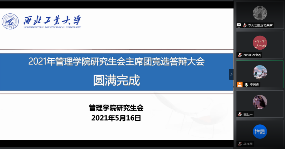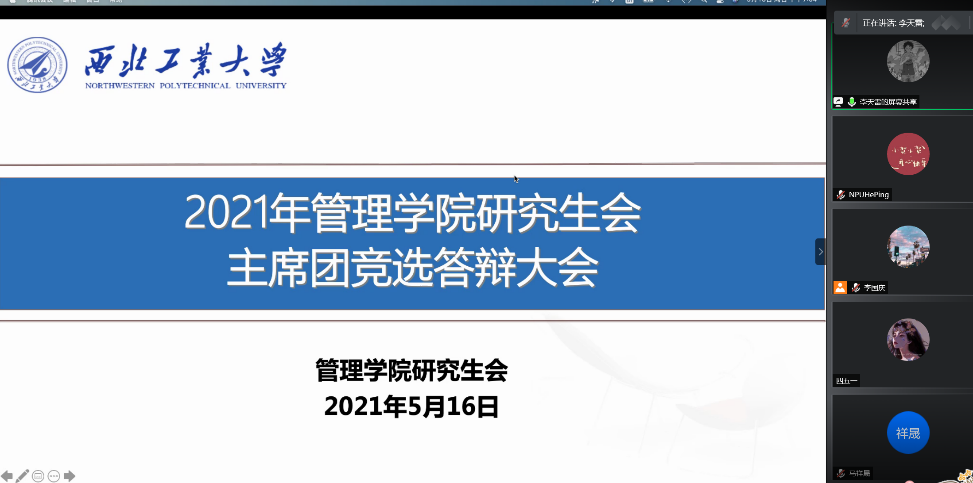 接下来,参与研会主席团竞选的同学按照抽签顺序依次进行了线上答辩。每位同学分别从个人情况、竞选原因和工作总结做了介绍。此外,他们还详细阐述了自己对研究生会未来工作的规划。同时,各位主席团成员也针对每位同学的不同情况依次做出指导,提出了建设性的意见。