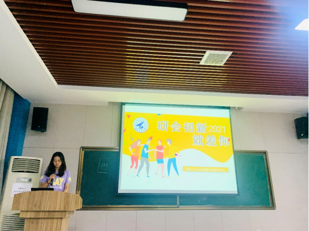 研究生会成员靳雪宁向大家介绍研会的各部门职能,并讲述了其亲身参加研会的收获与感悟,以此鼓励研一的同学们积极参与到研究生会中,为同学服务的同时也能提升自身的能力。
