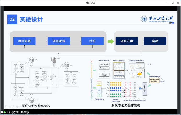实验设计方面,王秋实同学以医联体、多模态两篇论文为例,提出在进行实验设计时首先要熟悉项目场景,明确项目的目标是什么,之后确定项目逻辑,并与导师、师兄师姐们讨论制定项目方案,依据制定的项目方案展开实验。他指出,实验设计是一个反复讨论修改的过程。