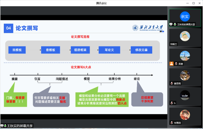 接着,王秋实同学总结了论文撰写流程和需要注意的六点内容。重点讲述了论文摘要部分要通过背景引入研究问题,说明研究问题的意义,以及论文针对研究问题做了什么,目的是什么,阐明论文的主要内容、创新点、取得的效果等;模型部分最好通过一个架构图直观的展现论文研究思路,架构图的绘制要深思熟虑,尽可能把论文涉及的要点都包含进去,此外绘图一定要美观,不美观的图可能会影响到论文的录用;结果分析部分要图表共用,所有的结果分析都要指向同一个目标,即都要支撑论文中的论点。最后,根据自身研究生期间的五次论文投稿经历,王秋实同学指出,期刊论文投稿是一场“持久战”,被好的期刊拒稿也很正常,对于审稿人的每条建议都要认真答复。