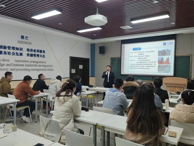 随后,杨康重点讲授了理论知识要与实践工作中紧密结合。杨康提出目标导向、底线思维、抓核心抓关键的思维方式,以华为公司为例,教导同学们“艰难困苦,玉汝于成”的道理永远不会过时,并结合工作经历总结了海外工程重点关注要点。接下来,杨康老师就重大工程项目中的目标管理、组织管理、范围管理和风险管理进行详细介绍。