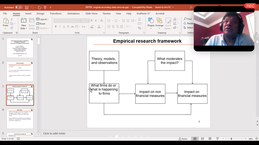 Prof.Vinod R. Singhalgave lesson on topic“Event Study”and the lesson has attracted more than40 listeners.Prof. Singhal started the course with“Empirical research framework”, then introduced the paper framework by“Theory, models, and observations”and“Impact on (non) financial measures”. Prof. Singhal encouraged also the students to participate into the lesson and answers to questions of students carefully.