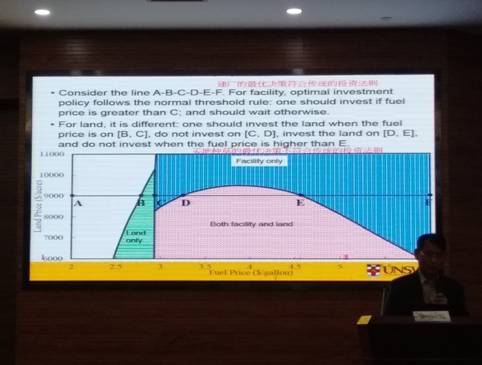 Chung-Li Tseng教授为师生报告了他最新的一项研究“考虑前置时间和风险厌恶程度的双源供应下纤维素生物燃料最优投资决策。生物燃油具有绿色环保性能,可以替代传统的生物化石燃油,但传统的生物燃油是用玉米等农作物炼制而成,这可能引起或加重食物短缺的问题,应用受到很大限制。利用植物秸秆炼油是一种新的先进技术,它的好处是节省了粮食,但受土地价格变动、投资额等的影响存在一定风险。对一个企业,针对植物秸秆炼油项目,是先建厂炼油,还是先买地保值,Chung-Li Tseng的研究给出了答案。