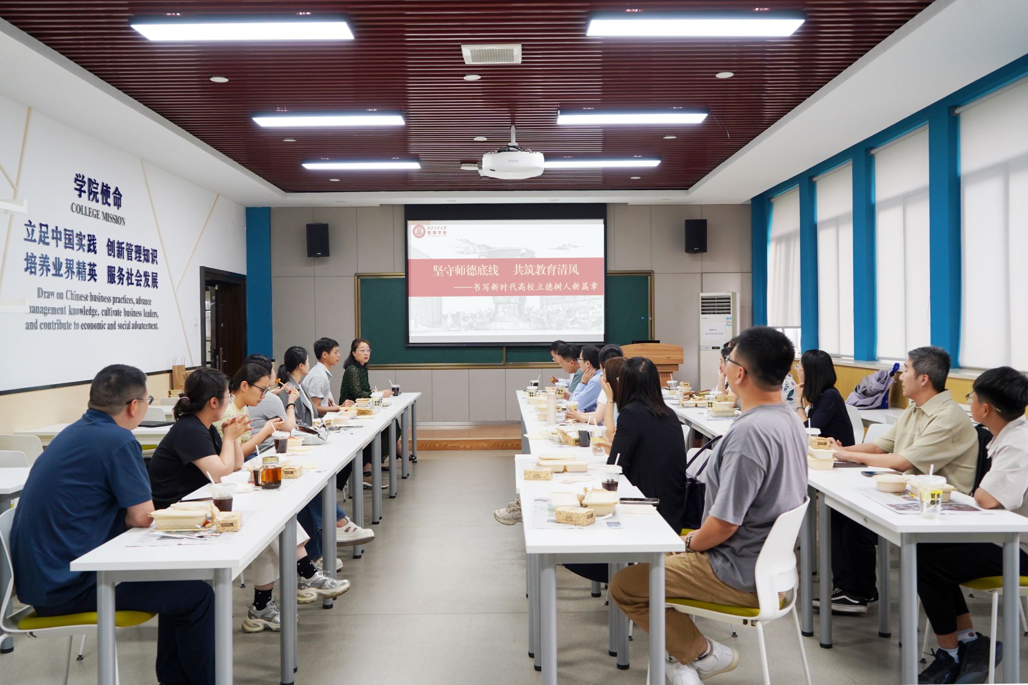 师德失范行为负面清单》等关于加强高校师德师风建设的基本政策文件,并以案例“说法明纪”,进一步明晰教师从业的底线与红线。她鼓励青年教师要以教育家精神为引领,脚踏实地,涵养师风师德,提升业务能力,教书育人,争做“四有”好老师,争做“大先生”。