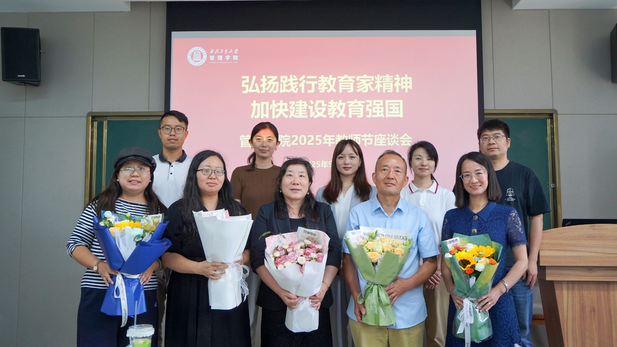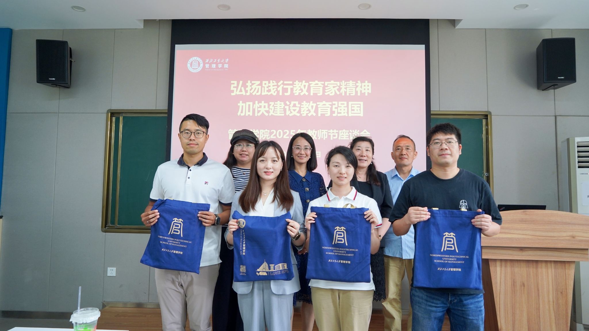 新入职青年教师为受表彰教师献花,受表彰教师为几位新入职的青年教师颁赠激光笔等入职纪念品。激光为笔,承古训戒尺之意,是数字时代的教鞭,既指引方向,也鞭策求知与进步。