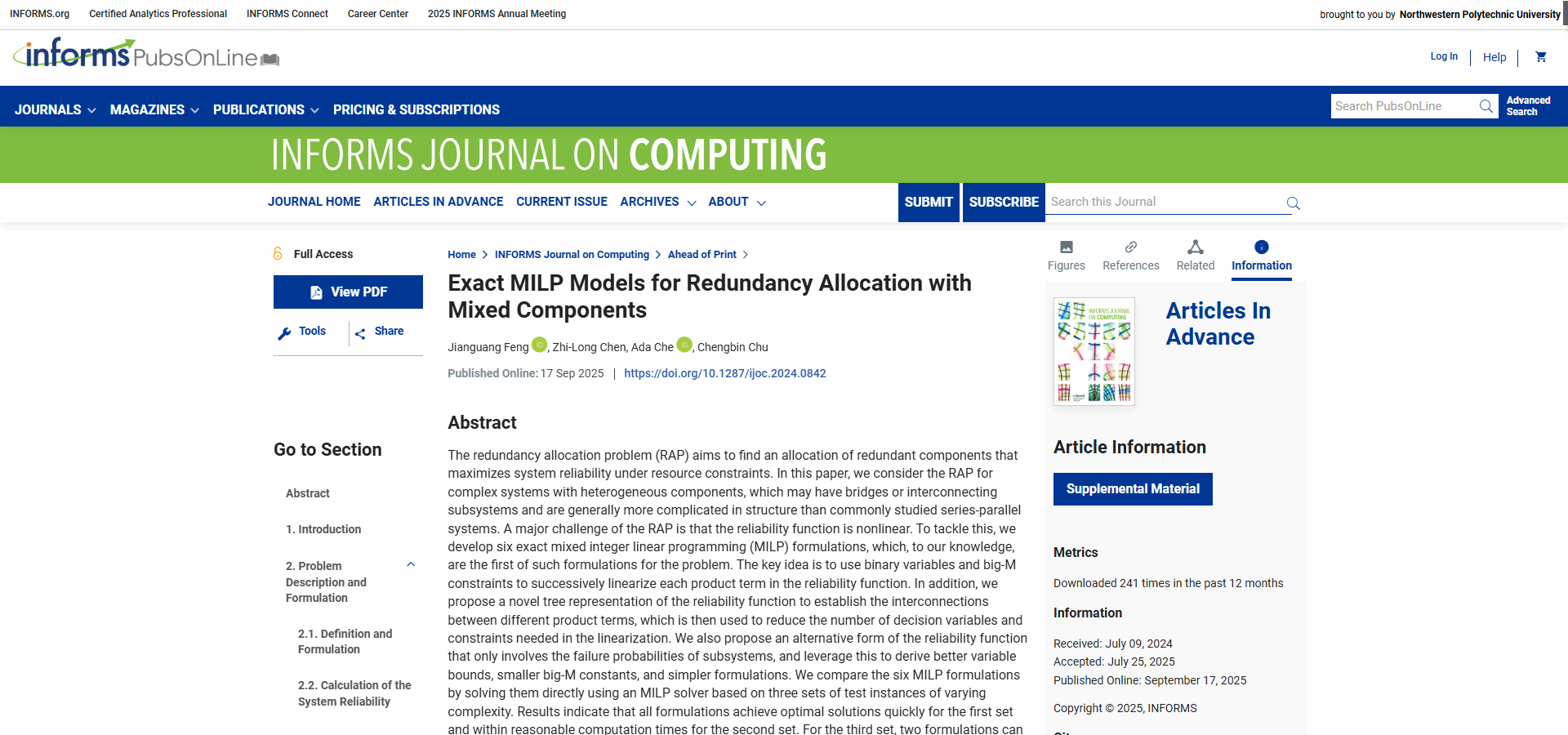 《INFORMS Journal on Computing》是运筹学和管理学研究协会(INFORMS)会刊,为运筹优化领域顶级期刊,是美国University of Texas at Dallas选出的商学院最顶尖24种学术期刊(简称UTD24)之一。