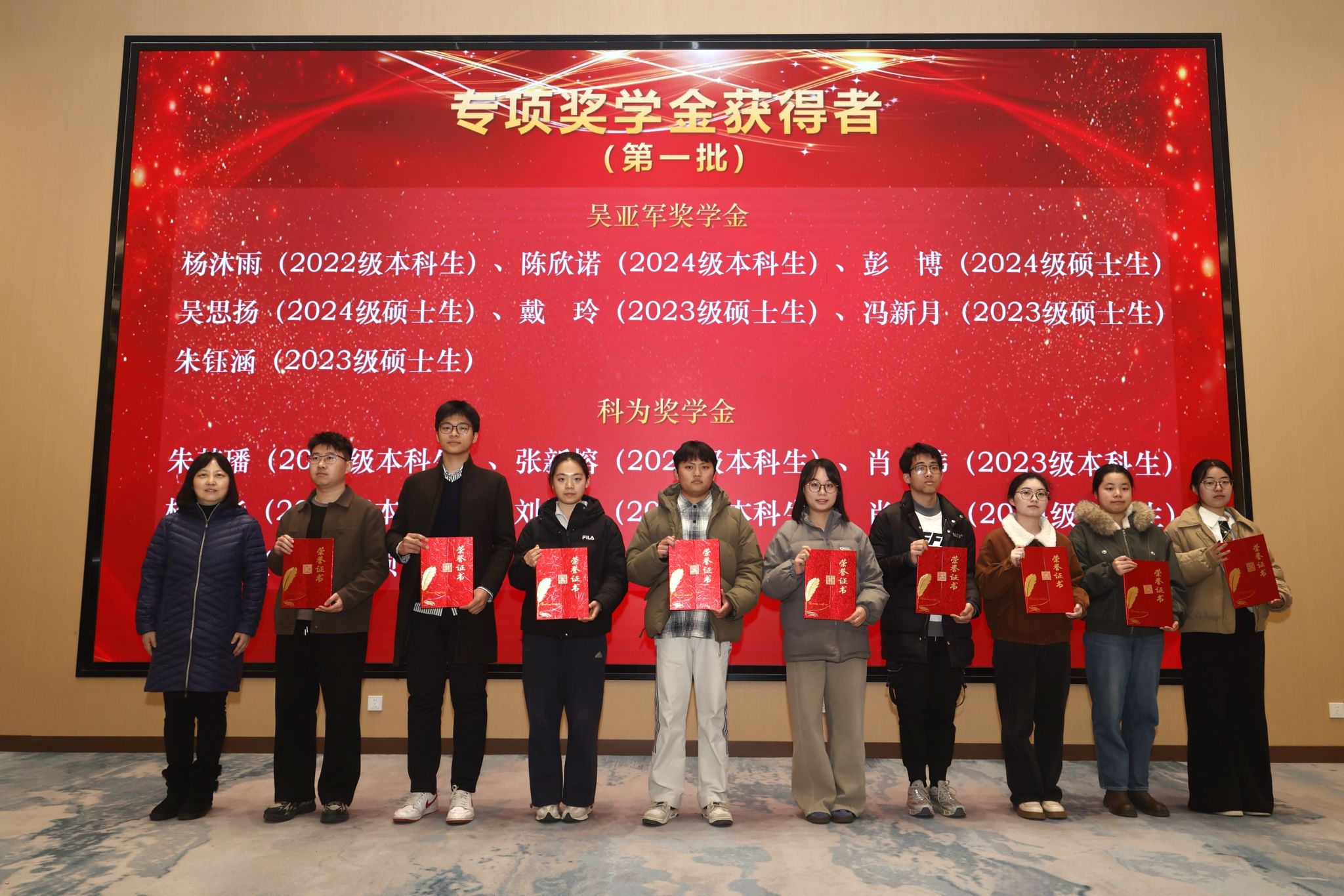 班主任祝建辉、介任龙为学院奖学金获奖代表颁奖