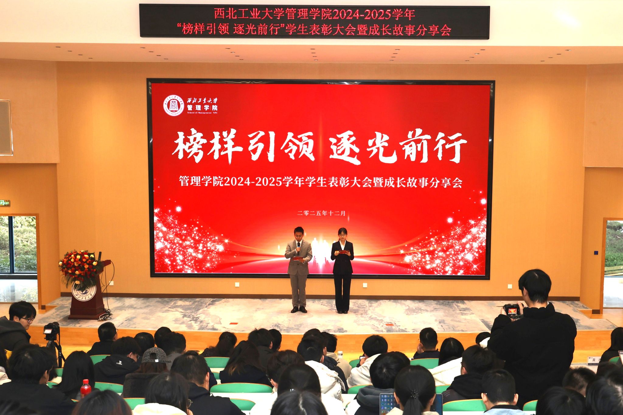党委书记张爽、院长车阿大、副院长陈琳、副书记王海啸、院长助理李乘龙、班主任代表、全体学工干部、受表彰的先进集体和优秀学生代表、各年级学生代表共同参加了大会。2024级硕士生王萌和2024级本科生邓炅杰共同主持本次活动。