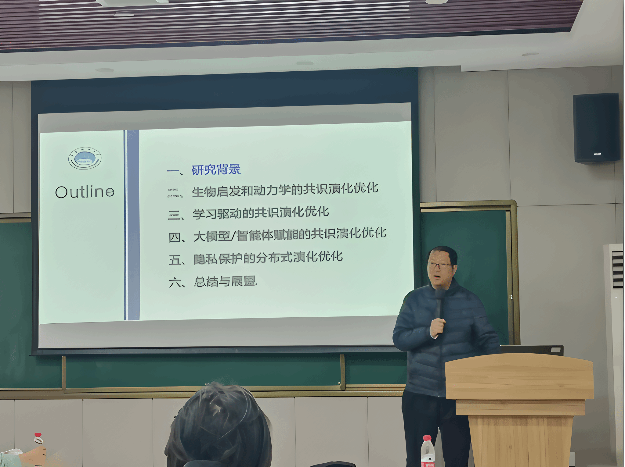 师生对陈教授的到来表示了热烈的欢迎。此次报告会,陈教授介绍了面对实际应用中普遍存在的非凸、黑箱、高维等复杂优化场景,如何应对分布式环境下群体智能决策与优化所面临的挑战。首先,介绍了生物启发和动力学的共识演化优化、学习驱动的共识演化优化,对其中基于内外部学习的多智能体粒子群优化、强化学习辅助的共识演化优化等研究进行了详细讲述。其次,介绍了大模型/智能体赋能的共识演化优化、隐私保护的分布式演化优化,为师生展示了多角色LLM协作的Agent超启发式策略自主设计、面向组合优化的隐私保护遗传算法等研究。最后,陈教授对分布式进化计算进行了总结与展望。