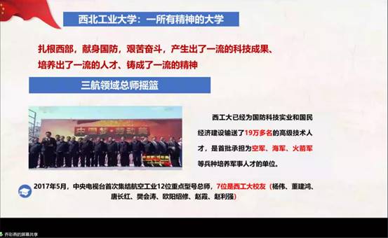 乔书记以校史文化、三航特色领风骚、三航文化育栋梁及院情院史概况四个部分为主线,详细介绍了我校脉源三支的发展历程,展现了我校从民族危亡之际诞生、在艰苦抗战之中坚守、为国家发展之局西迁的伟大创举;也介绍了西工大参与重大项目研制,多次获得国家级荣誉,服务三航领域、服务国防建设的鲜明特色。三航文化感染着西工大人,献身国防,成就了三航领域总师摇篮,形成了独特的“西工大现象”。乔书记通过生动形象的讲解和细致感人的故事,使同学们深入认识到学校和学院厚重的历史积淀及文化底蕴,激发了强烈的认同感和归属感,大家倍感骄傲和自豪。