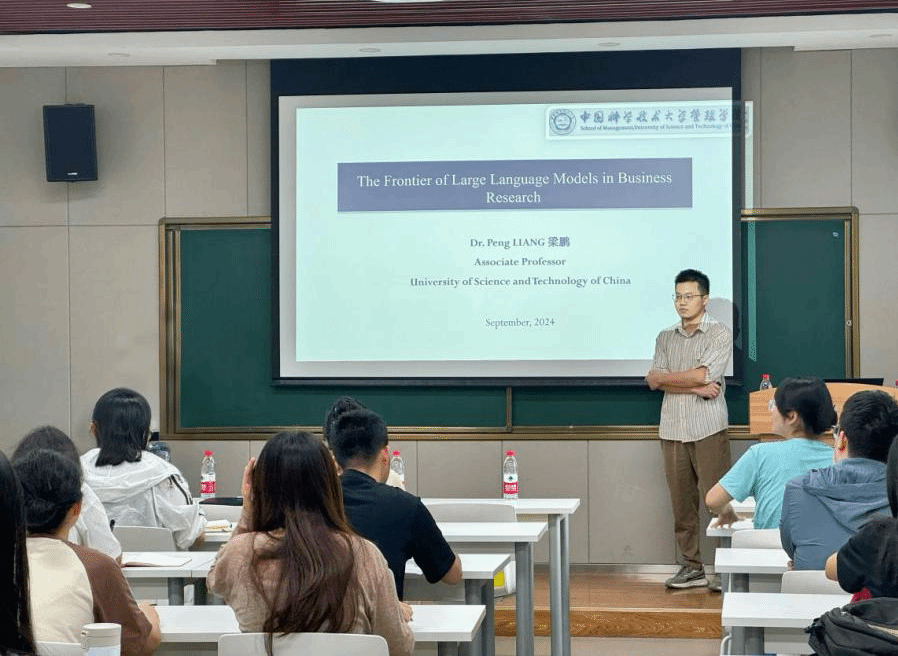 报告会伊始,主持人龚汨嘉老师对梁鹏副教授的研究方向、科研成果及学术贡献等进行了介绍,参会师生对梁鹏副教授的到来表示热烈的欢迎。此次讲座,梁鹏副教授首先从AI与机器学习、深度学习的联系与区别出发,并结合近年来AI发展历程,阐述了大语言模型(LLM)的概念与原理。其次,梁鹏副教授简要介绍了如何使用BERT和GPT处理海量数据,同时着重分享了GPT等大语言模型在国际顶级期刊中不同维度下的应用与探索。最后,梁鹏副教授提出了一些关于LLM的思考以及未来可供参考的研究方向,并指出大语言模型在使用过程中可能存在信息偏差与伦理风险。