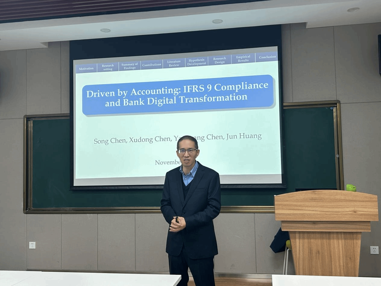 邀请,上海财经大学黄俊教授在长安校区学院楼214报告厅与学院师生展开学术交流,作题为“Driven by Accounting:IFRS 9 Compliance and Bank Digital Transformation(会计驱动:IFRS 9合规与银行数字化转型)”的学术报告。本次报告会由漫岛动漫