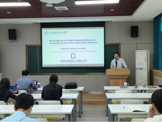 师生对吴教授的到来表示了热烈的欢迎。此次报告会,吴教授介绍了如何在经典的前景理论指导下,采用数据驱动的方式,对参考点依赖的消费者选择行为进行深度学习,并据此设计推荐系统ArcRec。首先,介绍如何从消费者历史购买记录中构建商品属性级别的参考网络,从而可以建模消费者细粒度的参考效应。其次,基于图神经网络构建了参考点依赖的效用函数,同时量化了消费者兴趣驱动和价格驱动的复杂偏好,并且引入商品属性级别的支付意愿指标来捕捉消费者的价格敏感性。在此基础上采用数据驱动的方式,对参考点依赖的消费者选择行为进行深度学习,从而提出了推荐系统ArcRec。最后,通过仿真实验与真实场景数据验证,证明该推荐系统的可解释性以及在推荐精度上的显著提升。此外,吴教授结合研究实例,分享了管理类顶级期刊的投稿经验。