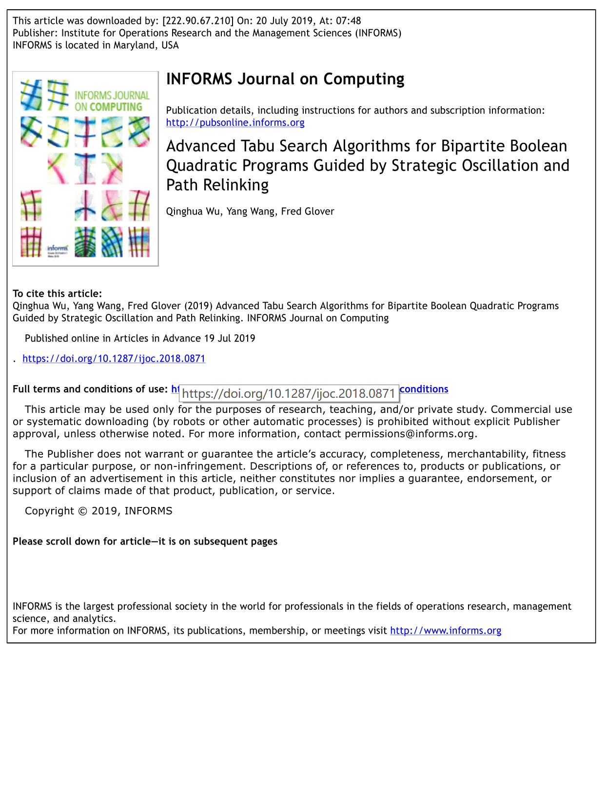 王阳副教授作为通讯作者与华中科技大学吴庆华副教授、美国工程院院士Fred Glover博士合作,在国际管理学领域最顶尖的UT-Dallas 24期刊《Informs Journal on Computing》上发表题为“Advanced Tabu Search Algorithms for Bipartite Boolean Quadratic Programs Guided by Strategic Oscillation and Path Relinking”的学术论文。