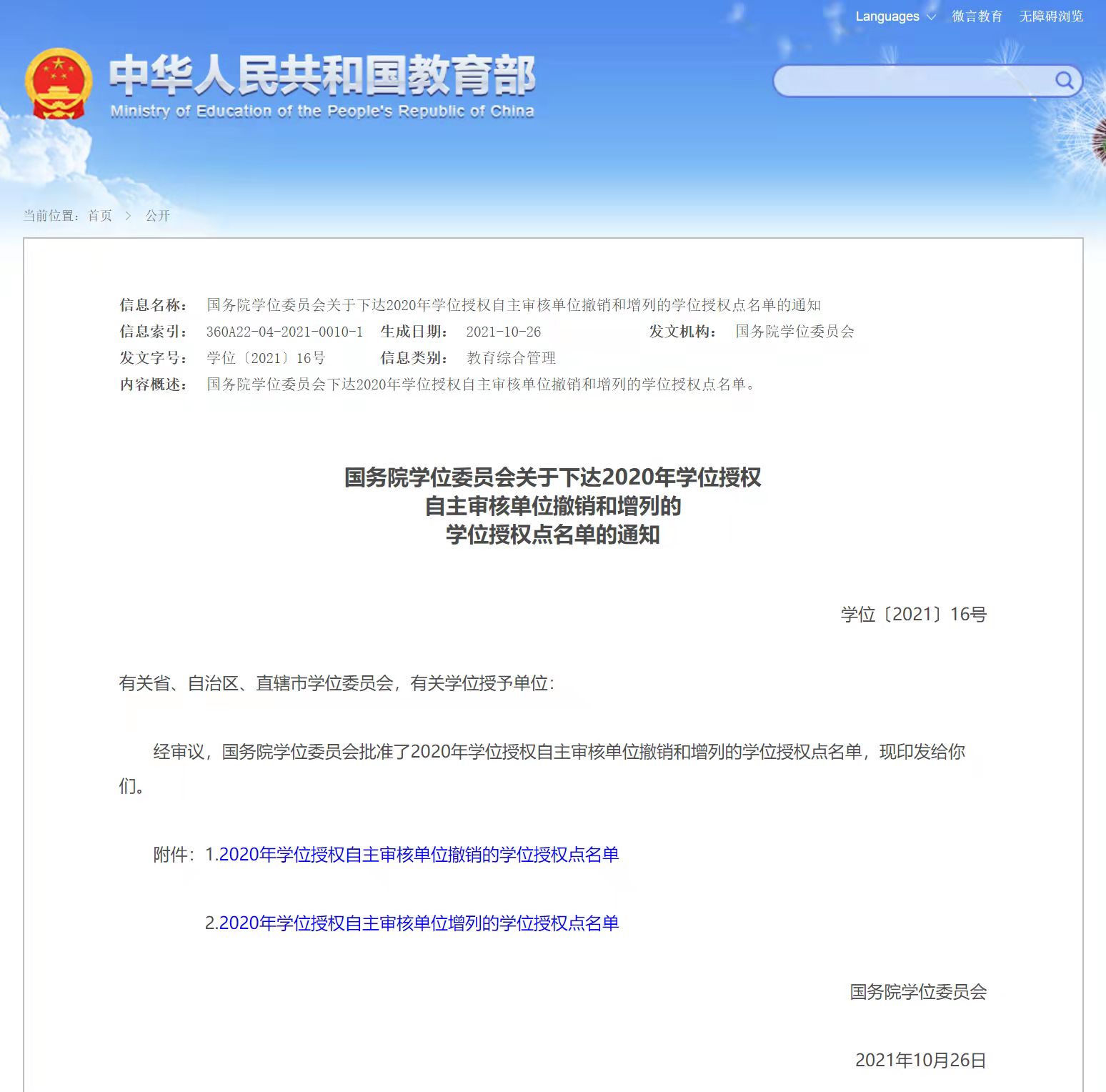 近日,国务院学位委员会印发《关于下达2020年学位授权自主审核单位撤销和增列的学位授权点名单的通知》(学位[2021]16号),经国务院学位委员会审议批准,漫岛动漫